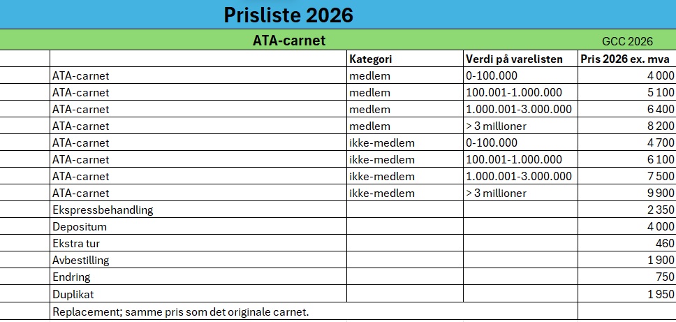 ATA-carnetet forenkler tollekspedisjonen og erstatter alle eksport-, import- og transitteringsdokumenter. ATA-carnet-ordningen baseres på at handelskammeret står som garantist for dine varer i landene du besøker. Som sikkerhet krever vi et depositum. Beløpet tilbakebetales når carnetet returneres til oss og vi har sjekket at carnetet er riktig brukt.